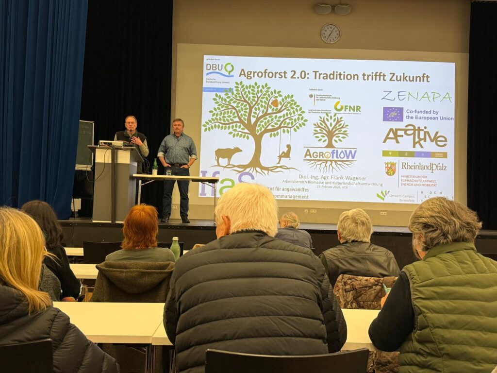Der Agraringenieur Frank Wagener arbeitet mit verschiedenen inter- und transdisziplinären Arbeitsgruppen an der Wiederbelebung und Nutzbarmachung der Agroforstwirtschaft. Er stellte Ergebnisse aus mehr als fünf Projekten in einem zweistündigen Vortrag vor und zeigte damit, wie traditionelles und modernes Wissen ineinandergreifen und daraus neue Kultursysteme in der Agroforstwirtschaft entstehen. Hier trifft Tradition die Zukunft: Er spannte den Bogen vom kulturhistorischen Hintergrund bis zu hochmodernen Analysen von Wasserabfluss- und Wasserrückhaltesystemen. Dürre und Starkregen sind Wetterextreme, die immer häufiger und intensiver in Europa auftreten. Bäume und Sträucher in der Agroforstwirtschaft bieten eine Möglichkeit, um diese Auswirkungen abzumildern und Gefahren zu reduzieren.